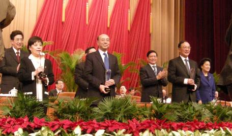 北京市副市長茍仲文宣讀《關(guān)于表彰中關(guān)村20周年突出貢獻企業(yè)175家(單位)和個人(135人)的決定》。會議主席臺的領(lǐng)導(dǎo)分別為受表彰的企業(yè)和表彰個人代表頒發(fā)了獎牌,時代集團公司榮獲中關(guān)村20周年突出貢獻企業(yè)獎,王小蘭總裁獲得了中關(guān)村20周年突出貢獻個人獎,并作為獲獎代表上臺接受了領(lǐng)導(dǎo)的頒獎。